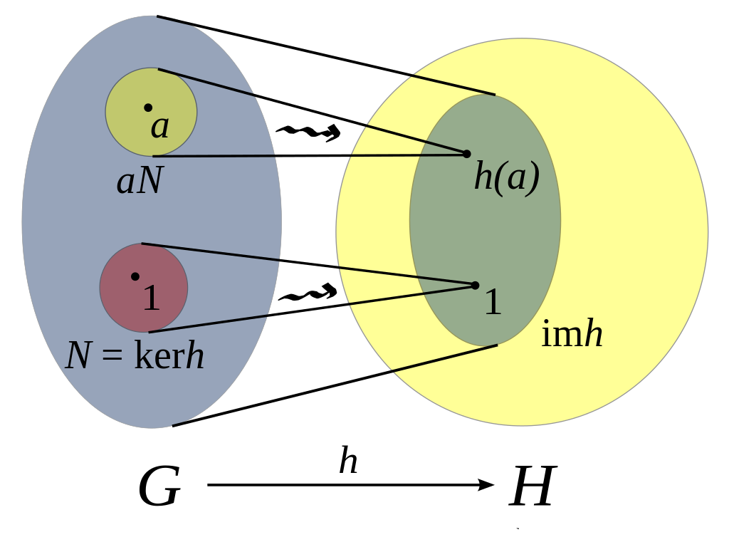 - is the so-called kernel of the map . This is simply the set of all elements which map to the neutral element. You might have heard of the concept of kernel or null-space in linear algebra. The concept is related - for every linear map (or more concretely matrix), there is some set of elements in the domain, which maps to in the codomain. So in our case it is simply consider the following set: